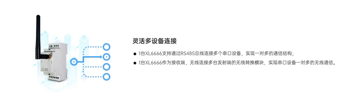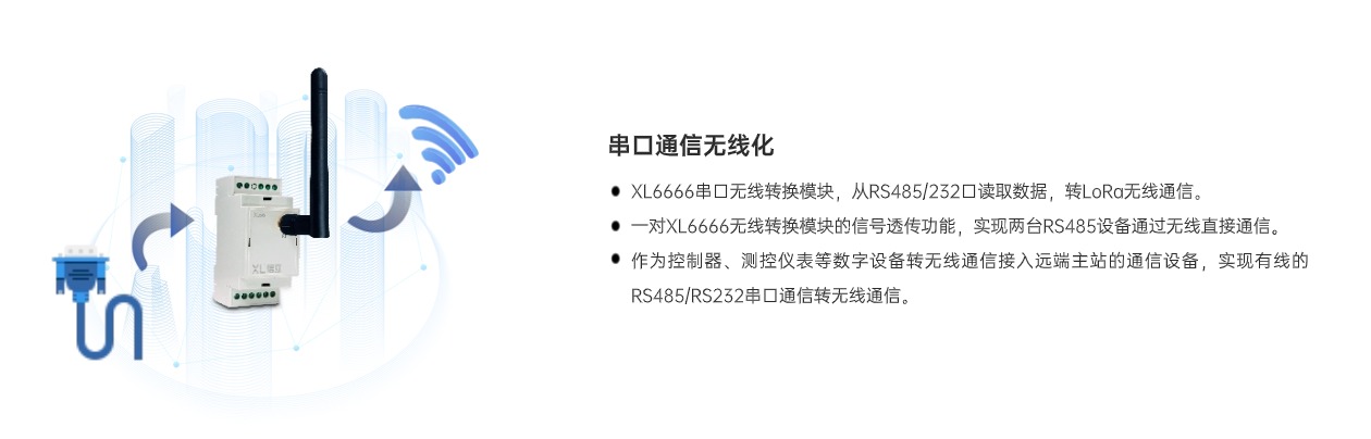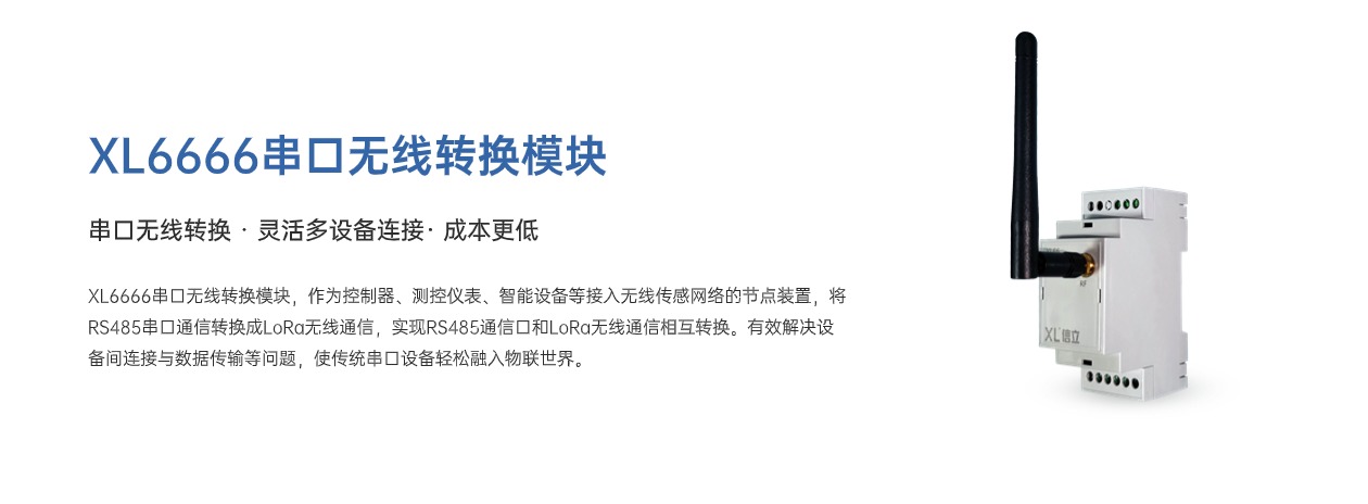 XL6666串口無(wú)線轉(zhuǎn)換模塊,作為控制器、測(cè)控儀表、智能設(shè)備等接入無(wú)線傳感網(wǎng)絡(luò)的節(jié)點(diǎn)裝置,將RS485串口通信轉(zhuǎn)換成LoRa無(wú)線通信,實(shí)現(xiàn)RS485通信口和LoRa無(wú)線通信相互轉(zhuǎn)換。有效解決設(shè)備間連接與數(shù)據(jù)傳輸?shù)葐栴},使傳統(tǒng)串口設(shè)備輕松融入物聯(lián)世界。