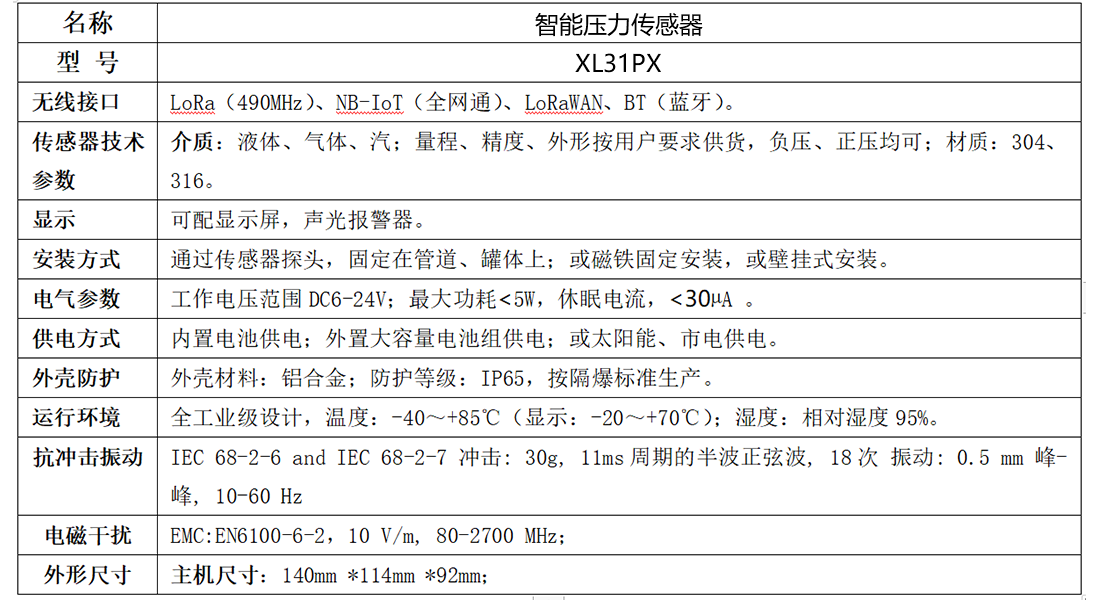 XL31PX智能壓力傳感器技術(shù)參數(shù)