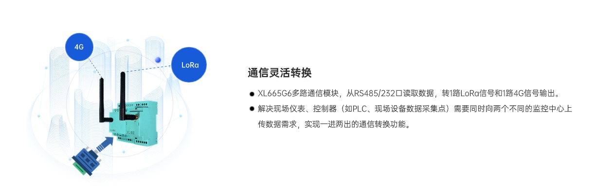 XL665G6多路通信模塊是一款高效靈活的通信轉(zhuǎn)換設備,可將RS485設備的一路輸出信號,轉(zhuǎn)為1路LoRa輸出信號和1路4G輸出信號,有效滿足了工控設備同時將數(shù)據(jù)接入兩個Modbus主站的需求,簡單、方便、易用,成本更低,滿足多種場景需求。