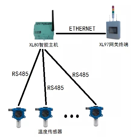 我司低溫檢測(cè)監(jiān)測(cè)系統(tǒng),選用XL97網(wǎng)關(guān)終端。通過(guò)采用RS485線的方式將各監(jiān)測(cè)點(diǎn)的數(shù)據(jù)傳輸至XL80智能主機(jī),智能主機(jī)再通過(guò)ETHERNET方式將數(shù)據(jù)上傳至XL97網(wǎng)關(guān)終端,網(wǎng)關(guān)終端將傳來(lái)的數(shù)據(jù)進(jìn)行分析處理后,直觀的將監(jiān)測(cè)點(diǎn)的實(shí)時(shí)溫度值顯示出來(lái)。