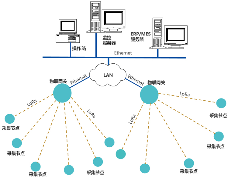 采集點裝置,通過LoRa無線通訊上傳數(shù)據(jù)至物聯(lián)網(wǎng)關(guān),網(wǎng)關(guān)通過Ethernet或Wi-Fi,接入LAN,推送數(shù)據(jù)至企業(yè)生產(chǎn)管控服務(wù)器。LoRa無線通信網(wǎng)絡(luò)技術(shù)參數(shù):