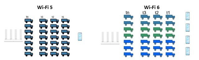 我們可以將路由器向設(shè)備傳輸?shù)膱鼍氨扔鞒梢粋€(gè)車隊(duì),在WiF i5標(biāo)準(zhǔn)下,同一時(shí)刻出發(fā)車隊(duì)只能派送到一個(gè)客戶,即使有空車也照常發(fā)車,如果有車出現(xiàn)故障(受干擾),整個(gè)車隊(duì)都無法發(fā)車。而在WiFi 6標(biāo)準(zhǔn)下,同一時(shí)刻出發(fā)的一個(gè)車隊(duì),可以將相鄰的最少26輛車組成一個(gè)小隊(duì),每個(gè)小隊(duì)可以派送到不同的客戶,如果有車出現(xiàn)故障(受干擾)只影響所在的小隊(duì)。