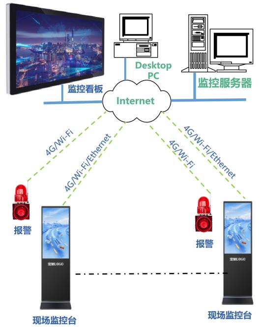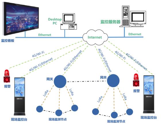 l 根據(jù)工地情況,選Ethernet、Wi-Fi、4G等多種方式結(jié)合的通信方案,實(shí)現(xiàn)平臺(tái)監(jiān)控服務(wù)器和網(wǎng)關(guān)、看板、現(xiàn)場(chǎng)監(jiān)控臺(tái)、聲光報(bào)警器、移動(dòng)終端等設(shè)備的通信。
