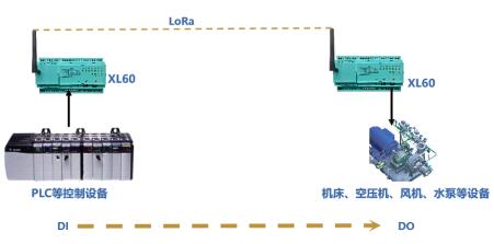 選用一對基于LoRa無線傳輸模塊的XL60無線采集裝置,一臺配置在作業(yè)現(xiàn)場作信號接收端,一臺與PLC等控制儀表對接作信號發(fā)射端。發(fā)射端的XL60將控制儀表的啟停命令,通過LoRa無線對傳到接收端,實現(xiàn)無線遠(yuǎn)程控制設(shè)備啟、停。