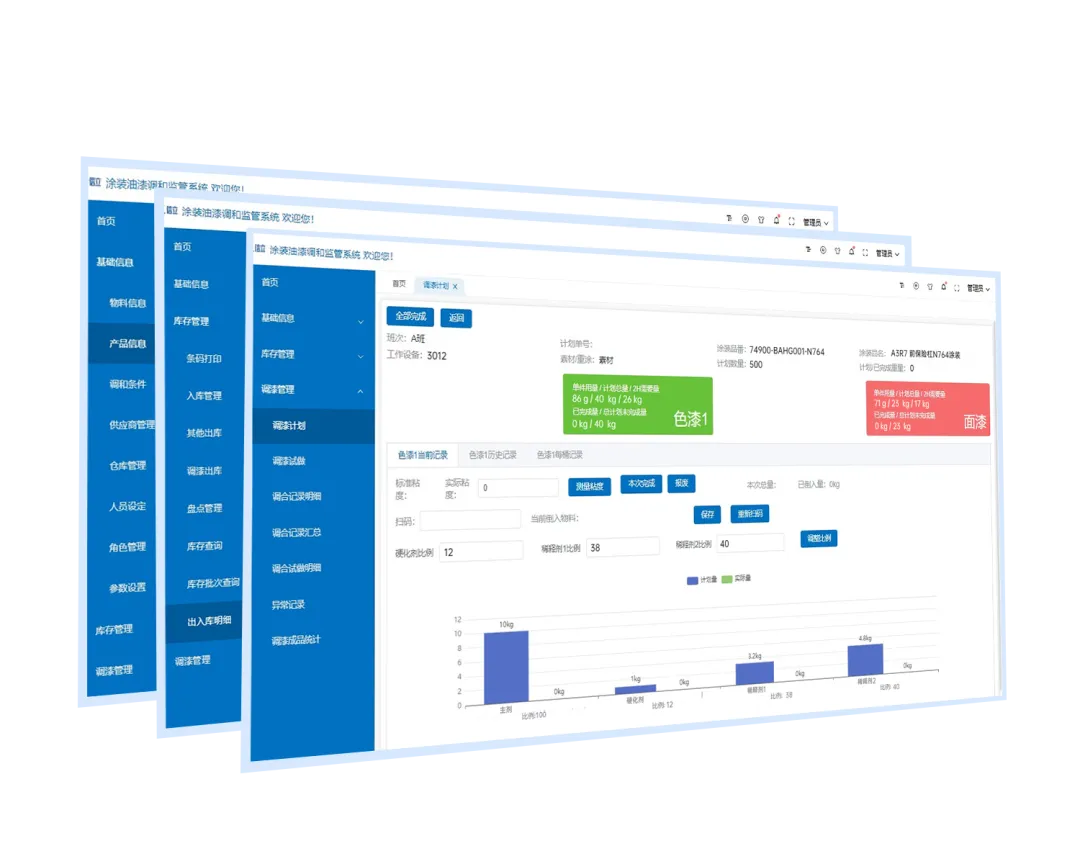 l 平臺自動記錄、生成用戶所需的各類報表,如調(diào)漆成品統(tǒng)計、庫存余料盤點(diǎn)等報表;