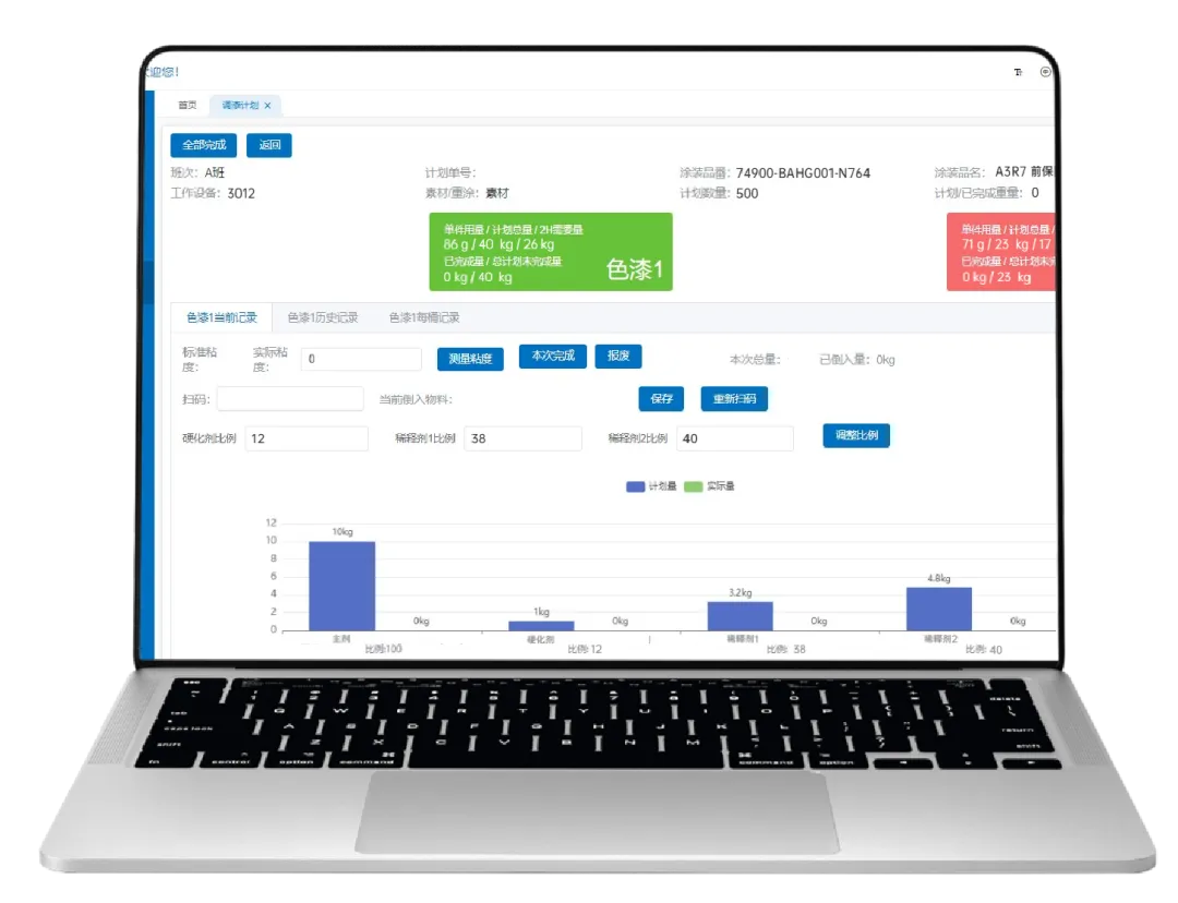 當(dāng)某種原料倒入過多,系統(tǒng)彈窗報警,經(jīng)上級權(quán)限確認(rèn)后系統(tǒng)根據(jù)給定配比,自動更新各原料所需重量。整個調(diào)漆過程,操作員只需遵循系統(tǒng)操作流程倒入原料,大大降低調(diào)漆人員準(zhǔn)入門檻,打破傳統(tǒng)依賴經(jīng)驗(yàn)的調(diào)漆模式。