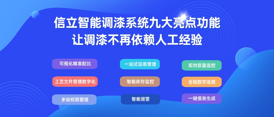 信立智能調(diào)漆系統(tǒng)XPMS,九大亮點(diǎn)功能設(shè)計,逐一解決調(diào)漆過程固有問題,降低對人的依賴,減少漆料浪費(fèi),更準(zhǔn)確完整地計算統(tǒng)計漆料的使用及產(chǎn)出。