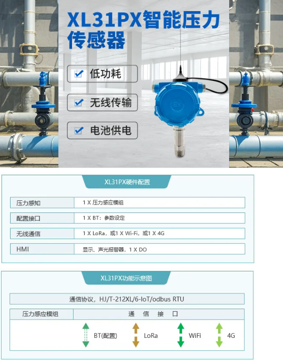 XL31PX智能壓力傳感器通過(guò)4G無(wú)線通信技術(shù),實(shí)現(xiàn)遠(yuǎn)距離、快速傳輸壓力數(shù)據(jù)至云平臺(tái)。