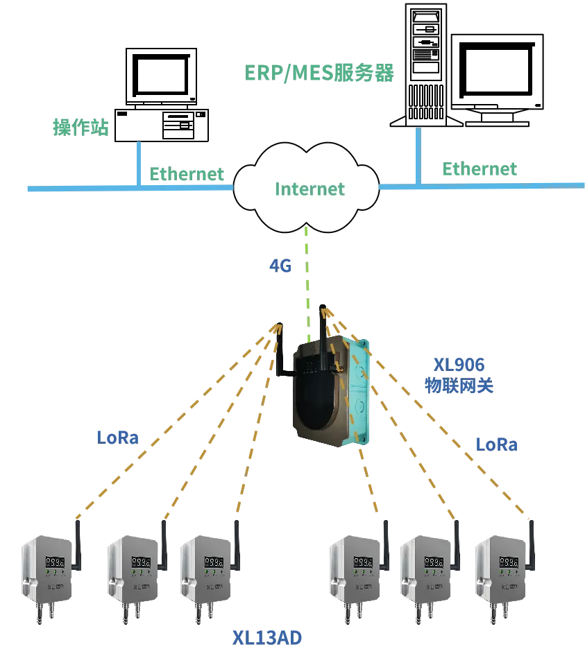為規(guī)避布線破壞潔凈室氣密性,方案采用無線組網(wǎng)方式,XL13AD無線壓差傳感器通過LoRa無線傳輸壓差數(shù)據(jù)至XL90物聯(lián)網(wǎng)關,物聯(lián)網(wǎng)關通過4G傳輸數(shù)據(jù)至云平臺。